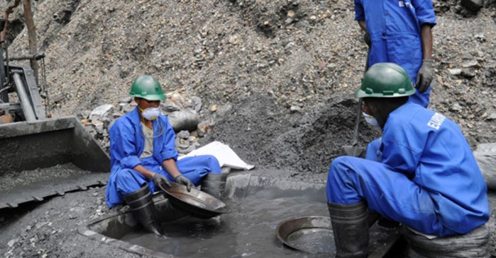 Workers at a mining site sift through mineral-rich soil using traditional panning techniques, as machinery operates nearby to support the extraction process. Courtesy